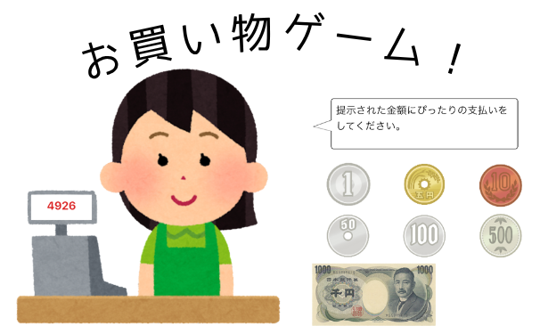1円から500円の硬貨と金額の対応を学ぶゲームです。
